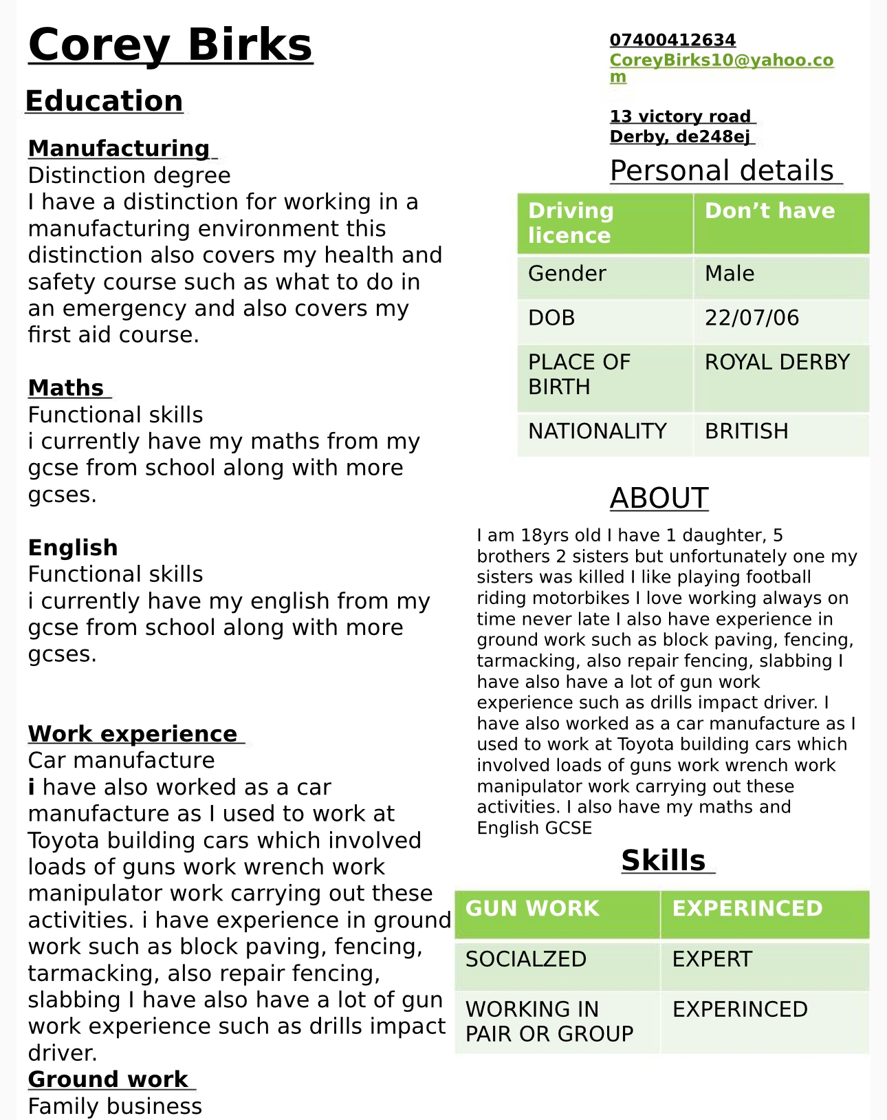 I am 18yrs old I have 1 daughter, 5 brothers 2 sisters but unfortunately one my sisters was killed I like playing football riding motorbikes I love working always on time never late I also have experience in ground work such as block paving, fencing, tarmacking, also repair fencing, slabbing I have also have a lot of gun work experience such as drills impact driver. I have also worked as a car manufacture as l used to work at Toyota building cars which involved loads of guns work wrench work manipulator work carrying out these activities. I also have my maths and English GCSE